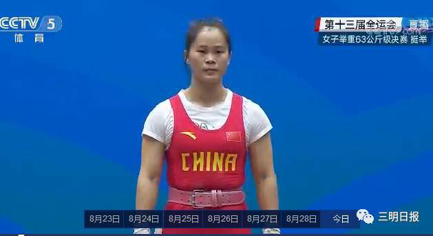昨晚,第13届全运会女子举重63公斤级的比赛,邓薇以251公斤的总成绩(抓举113公斤、挺举138公斤),获得金牌,这也是三明运动员在本届全运会上获得的首枚金牌 。