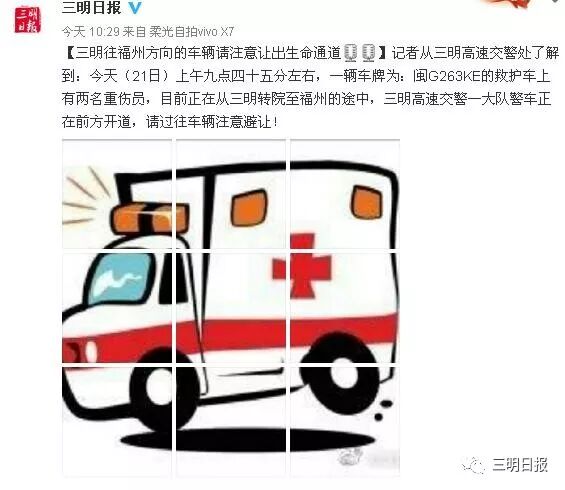 目前正在从三明转院至福州的途中,三明高速交警一大队警车正在前方开道,