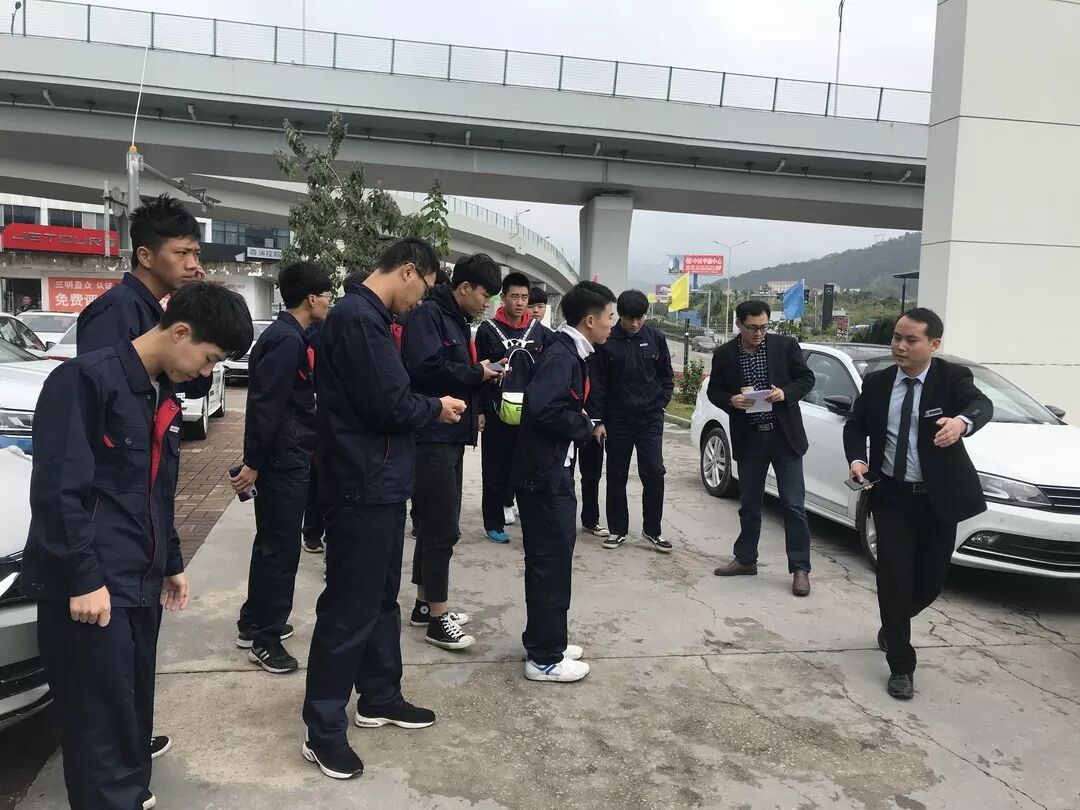 学生分组前往不同汽车4S店实践学习售前销售流程、售后维修保养、车辆维修实况等内容。