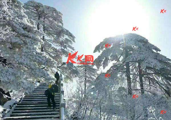 前方实拍。雪后黄山,云白雪白,高洁静谧,如临仙境。积雪浮在云端之上,遇上朝夕霞光,亲临见之方感祖国大好河山的壮美。