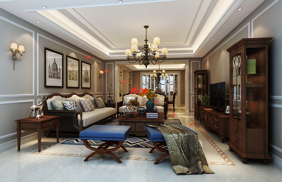 简约美式装修风格,古典中带有一点随意,摒弃了过多的繁琐与奢华。墙上白色的石膏线勾勒出装饰立体感,没有琐碎多余的设计,每处都格外的干净利落,而且现代实用。透露出美国西部道。
