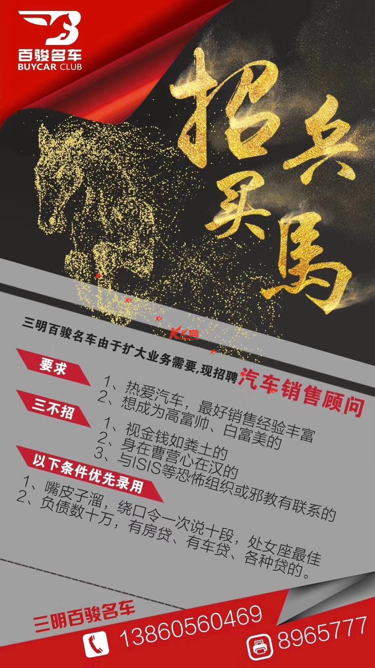 招兵买马:如果您暂时没工作,我建议您帮我卖车。朋友圈,我发什么您就转发什么,如果您有工作,我建议您兼职做我的中介。因为它不会影响您的工作和生活,一个月下来赚1000,您水果钱就有了;赚2000,吃饭的钱就有了 ...