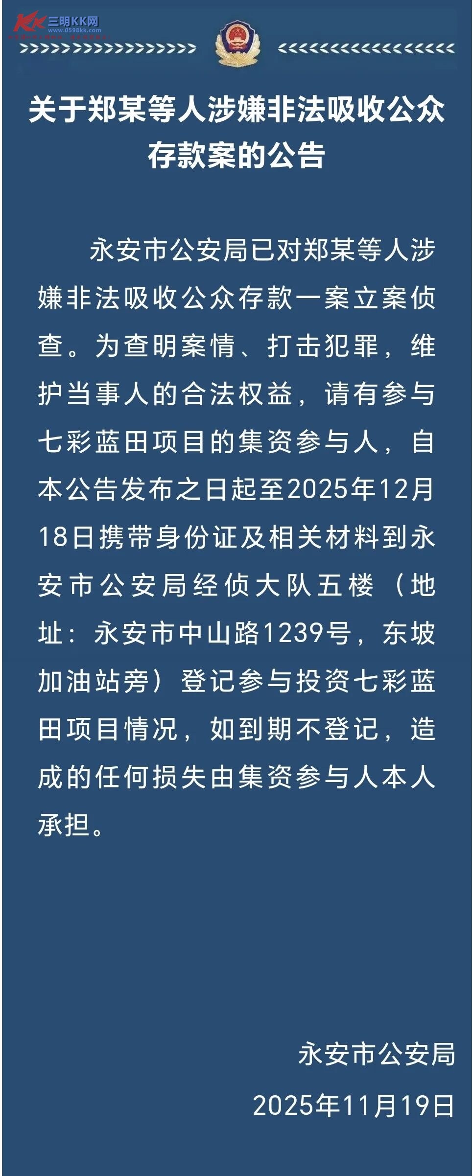 三明警方公告!郑某等涉嫌非法吸收公众存款,涉及七彩蓝田项目