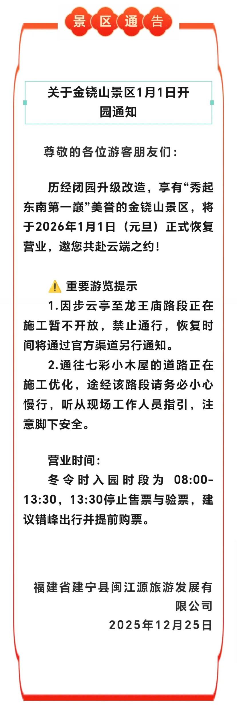 &nbsp; &nbsp;历经闭园升级改造,享有“秀起东南第一巅”美誉的建宁金铙山景区,将于2026年1月1日(元旦)正式恢复营业,邀您共赴云端之约!
